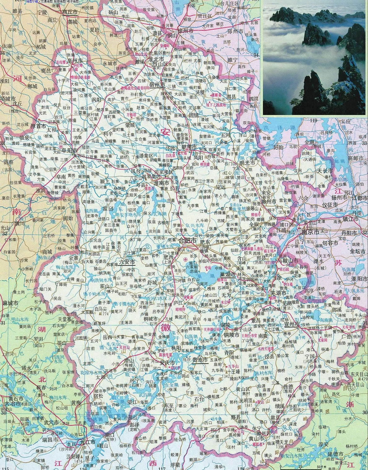 “兩根筷子夾著碗,屏障在西也在南,東面不平北邊平,黃山勝過(guò)九華山!边@首民謠形象地概括了安徽省的旅游地理面貌。兩條江河(長(zhǎng)江和淮河)像兩根筷子,巢湖如碗,西面的大別山和東南面的天目山如屏,北邊是一馬平川的江淮大平原。而皖南的黃山、九華山則是安徽最有名的風(fēng)景名勝區(qū)。