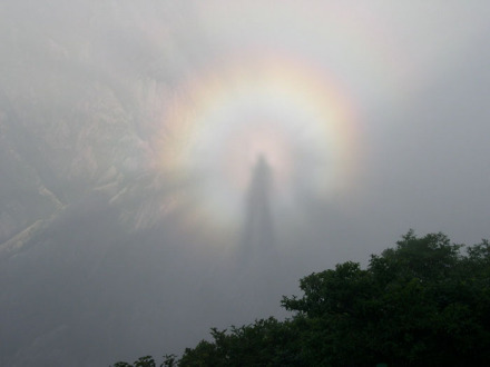 由于牯牛降獨特的地理及氣候條件,極易形成佛光,牯牛佛光清晰規(guī)整,顯現(xiàn)次數(shù)多,時間長。每當(dāng)雨過天晴,云霧匯聚之時,陽光穿云透霧,灑向山谷,云海上常會懸起一輪五彩光環(huán),光芒四射,艷如花盤,繽紛柔和,仿佛一臺緩緩滾動的佛輦,若隱若現(xiàn),妙趣橫生。通過陽光的作用,若游人奔跑跳躍,光環(huán)中的佛影也隨著舉手投足,配合默契,實為奇觀。