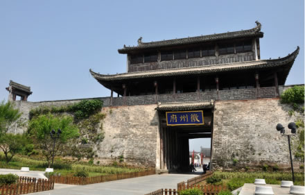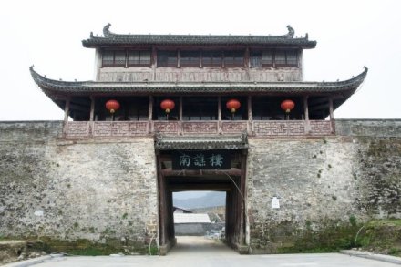 南譙樓,始建于隋末,為歙州(今徽州)人汪華吳王府外子城的正門(mén)門(mén)樓。南譙樓是古代夜間向人們報(bào)時(shí)的地方,打更的鼓聲就是從譙樓傳向四面八方的。南譙樓三重三開(kāi)間,高約20米,寬約15米,進(jìn)深約10米。磚木結(jié)構(gòu),懸山頂,重檐高脊,紫墻青瓦。下為門(mén)厥,門(mén)闕寬4.5米,左右各有木柱13根。每根柱圍1米余,每柱均呈10度左右斜倚墻壁,用以支撐大梁。1997年,國(guó)家文物局撥款重建,并基本保持了木構(gòu)清代風(fēng)格,門(mén)闕為宋代風(fēng)格。