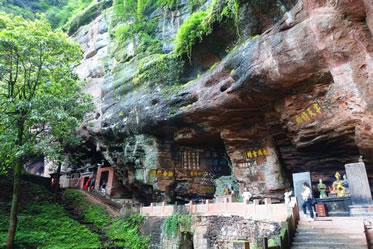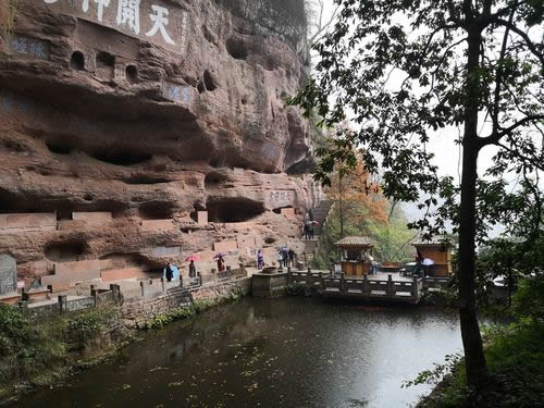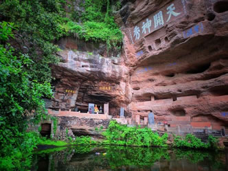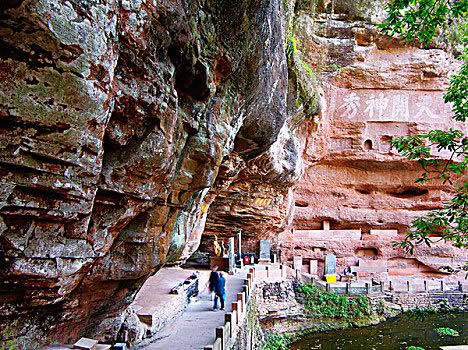 真仙洞府:過天門巖,下石階即達。這里危崖三彎折,相連如城垣。巖下通道沿砌石欄桿,欄外為碧蓮池,共構一“叵”字形;崖間洞窟累累,依次有八仙洞、觀音洞、真仙洞(羅漢洞)、雨君洞、文昌洞、白馬洞、珠簾洞,就洞建宮宇,祀道教各路神仙,統(tǒng)稱真仙洞府。崖壁、摩崖題字石刻,如“天開神秀”、“齊云勝景”等多達近百處。