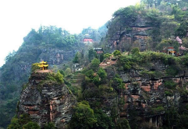 洞天福地:位于望仙亭東南,又稱桃源洞天。后倚丹崖?lián)泶氐恼拐a峰,前臨涓涓流淌的桃花澗。明代建有洞天福地祠、斗姆閣、寥陽殿、青羊宮,三元宮、桃源洞天亭等建筑,今圮;僅存八卦池、邋遢仙墓、仙人床及宮、閣、殿祠遺址。