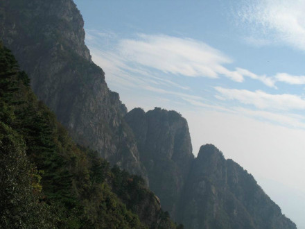 聽松石:位于圣卦峰西北200米處,巖石凌空欲飛,下臨千米深谷。右叢中古松排列,綠旗招展,松濤聲聲,如萬馬奔騰。