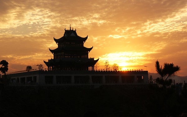 起名“問天閣”,源于2000多年前中國詩人屈原對自然界和人生求索的名作——《天問》,又因其為文博園最高建筑,問天閣這個名稱就應(yīng)運而生了。其座西面東,坐落在烽火臺座上,占地面積約3000平方米,為三層三重檐,呈方亭式,每面57米。