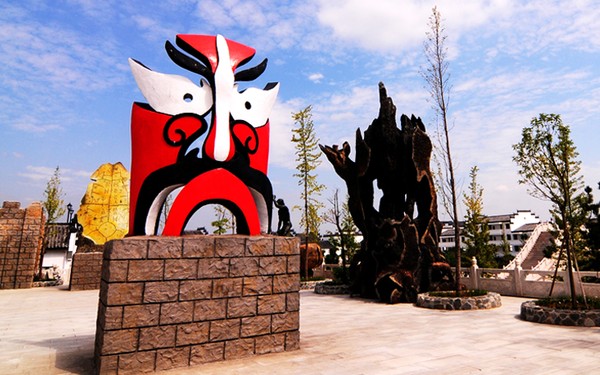 坐落于五千年文化長廊的京劇臉譜造型,其含基座高4米,寬1米6,并沒有根據(jù)某位人物造型打造,而出自于五千年文博園自己的創(chuàng)意,以紅白兩色為主色,大膽的運用寫真、夸張、抽象的藝術(shù)形式,結(jié)合獨創(chuàng)的手工藝制作而成。其色彩鮮明、立體感強、線條柔美,打破了固定譜式的束縛,完全從一個全新的角度理解和認識臉譜藝術(shù),試圖從中探求一條臉譜在現(xiàn)代生活中的現(xiàn)實意義和藝術(shù)價值。