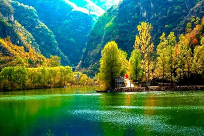 北京延慶烏龍峽谷景區(qū)——原名黑龍?zhí)。位于黑河的下游,屬距?.4億年前的中生代火山熔巖區(qū),全長2公里,是典型的山間河流深切河谷地貌景觀,峽谷兩側絕壁陡直、怪石林立,水聲轟鳴,浪花飛濺,以青山幽谷、碧水深潭遠近聞名。這里,懸崖陡壁,潭澗相連,依次為四潭、三潭、二潭、頭潭;其中,頭潭較闊,四潭最深。每年豐水時節(jié),峽谷內奔涌的河水從幾十米高的懸崖上飛瀉而下,激蕩于山澗巨石之間,但見浪濤擊石,銀花飛濺,雷鳴般的濤聲如群獅怒吼,煞是壯觀。