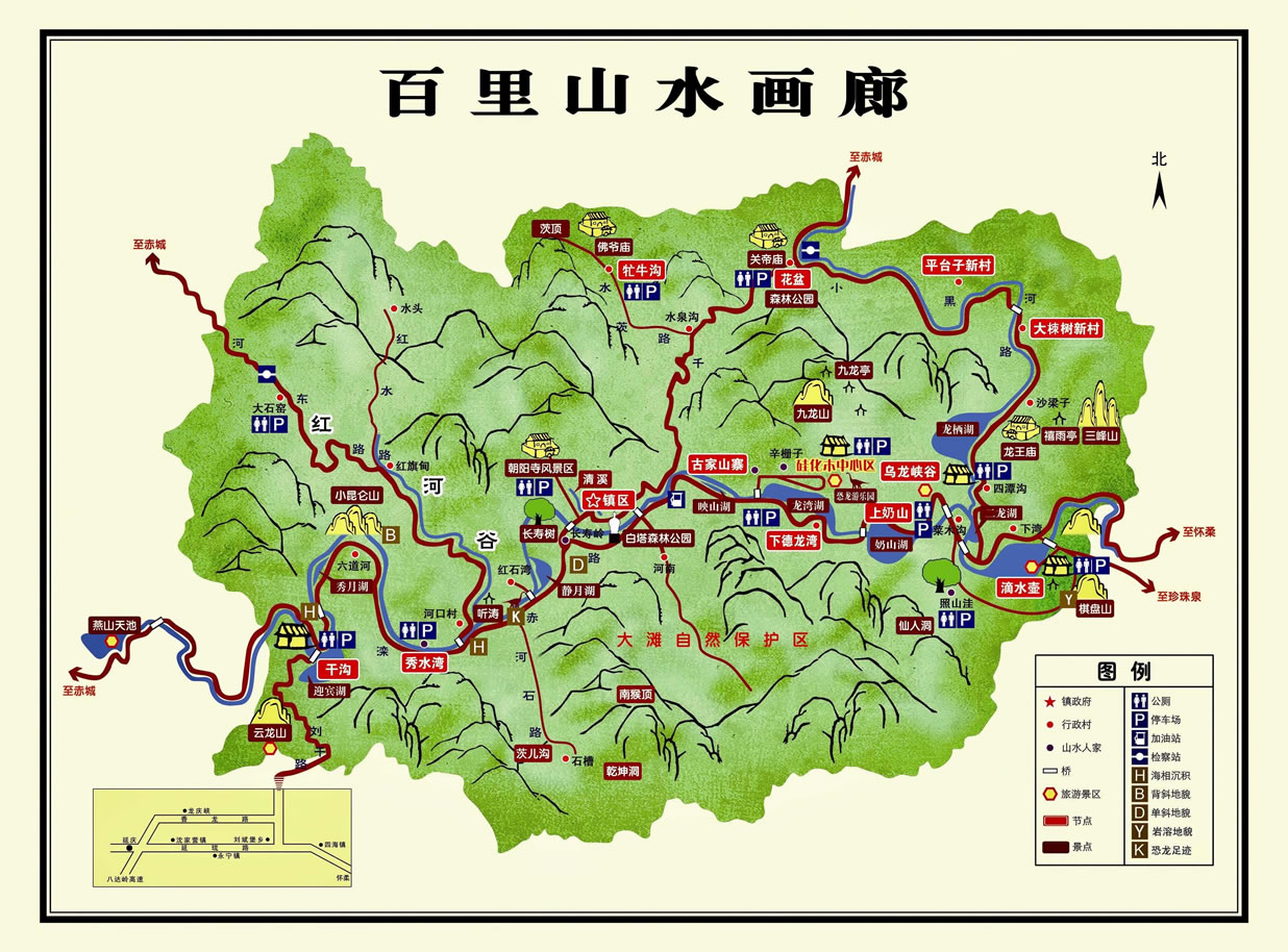 北京延慶百里山水畫廊景區(qū)位于延慶區(qū)東北部千家店鎮(zhèn)中國延慶世界地質公園千家店園區(qū)內,屬延慶生態(tài)涵養(yǎng)區(qū)的核心區(qū),總面積371平方公里,距縣城40公里,距北京市區(qū)110公里。東與懷柔區(qū)毗鄰,北與河北省赤城縣接壤,西南、東南分別于香營、劉斌堡、珍珠泉三個鄉(xiāng)相連。灤赤、花千、花沙公路穿鎮(zhèn)而過自成環(huán)線,交通便利。