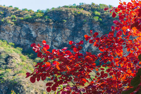 坡峰嶺景區(qū)春天時(shí)黃櫨花開,"三千粉色,花明如繡",滿樹毛絨的粉紅色黃櫨花傾灑在山谷中,層層迭迭,如粉色霧靄,置身其中如夢似幻。秋天時(shí)漫山紅葉,"紅葉綠中游,彩練當(dāng)空舞",種類豐富的植物資源使這里成為流動(dòng)的色彩海洋,猶如一幅波瀾壯闊的紅葉畫卷。