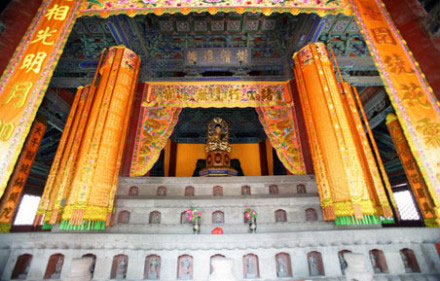 大雄寶殿:在天王殿后面,坐落在近兩米高的月臺上。門額上高懸清乾隆帝手書“蓮界香林”雕龍橫匾。原來還掛有清康熙帝所題“般若無照” 匾額和“禪心似鏡留明月,松韻如莫振舞風(fēng)”的楹聯(lián),今已不存。殿內(nèi)屋頂上有三個木雕藻井,上圓下方,井內(nèi)各雕有一條團龍。下方漢白玉石雕的須彌座上供有明代鑄造的銅質(zhì)橫三世佛。正中為釋迦牟尼佛,南側(cè)為阿彌陀佛。北側(cè)為藥師佛。每尊佛像高3.2米,重5000公斤。大殿前左右兩側(cè)各有三間配殿,左側(cè)為伽藍殿,右側(cè)為祖師殿。