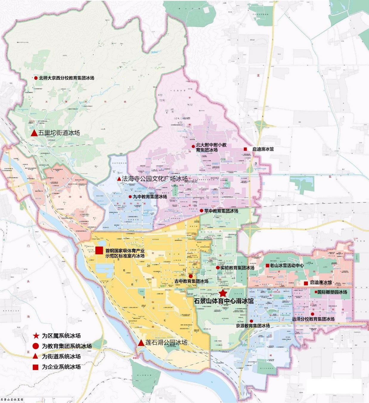 八寶山街道、老山街道、八角街道、古城街道、蘋果園街道、金頂街街道、廣寧街道、五里坨街道、魯谷街道
