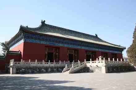 無梁殿:即齋宮正殿,建于明永樂十八年(1420年)。此殿因以磚拱承重,不用梁枋而得名。皇帝進出齋宮均在此舉行有關(guān)禮儀,F(xiàn)殿內(nèi)按乾隆時期原貌陳列,橫額“欽若昊天”為乾隆御筆,屏風、寶座均為原物。