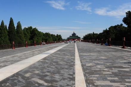 丹陛橋長360米,是連通圜丘壇和祈谷壇的一條高出地面4米的大道。大道中部下有東西向券洞通道,故名橋,是北京最古老的“立交橋”。橋面寬30米,中間石板大路為“神路”,供天帝專用;東側(cè)磚砌路面稱“御路”供皇帝專用,陪祀王公大臣只能在西側(cè)的“王路”上行走,上下進退等級分明。丹陛橋北高南低,北行令人步步登高,如臨天庭。