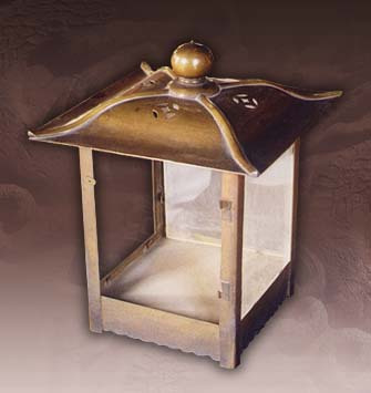 清末造。通高36.5厘米,檐方28厘米,足方20.6厘米。方形,四邊銅框,凹面玻璃心,一面為門,銅框兩側(cè)、底云花裝飾,挑形活頁二,桃形吊環(huán),底邊有花紋,蓋頂穹隆形,四脊間飾四縷空金錢眼紋,頂飾圓尖鈕。陳設(shè)于祭壇正位前和臺階上,用于祭祀時照明。