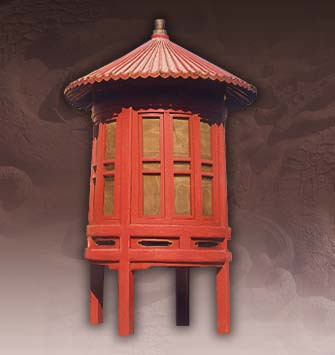 通高191厘米,燈罩邊長34厘米,托座邊長50厘米,高55厘米,寬42厘米,攢頤尖頂高8.5厘米,寬34厘米,六棱。底座長79厘米。座燈由燈罩、底座兩部分組成,燈罩六棱,上收,平頂,每面鑲透明玻璃。底座上以圓立柱支撐托座,以承燈罩。底座四歧呈十字形。通身紅色金緣。插燈與座燈同,只是底座插在石礎(chǔ)內(nèi),置于殿內(nèi)及路側(cè)。
