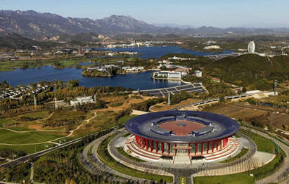 北京雁棲湖國(guó)際會(huì)展中心位于雁棲湖西南側(cè),坐落于范崎路上,建筑主體是圓形大樓,建筑造型外觀似天壇無(wú)蓋,寓意天圓地方,設(shè)計(jì)風(fēng)格與雁棲島上的雁棲湖國(guó)際會(huì)議中心相輔相成。主要功能是供各大公司 產(chǎn)品發(fā)布、展覽等等,2015年第五屆北京國(guó)際電影節(jié)開閉幕式舉辦地。