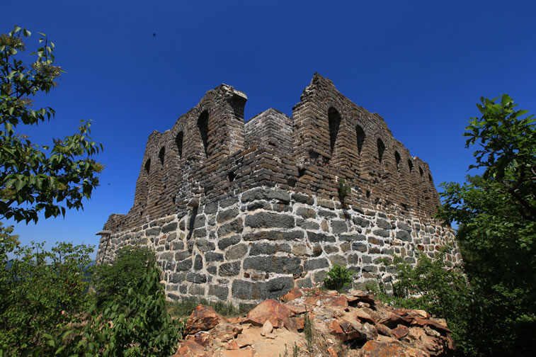 九眼樓長(zhǎng)城 九眼樓長(zhǎng)城位于四海鎮(zhèn)火焰山頂部。因敵樓每面有9個(gè)箭窗,故名。又因山勢(shì)高峻,晴天可望到北京城,故也稱(chēng)望京樓。為長(zhǎng)城重要關(guān)口之一。海拔1141米,F(xiàn)樓內(nèi)有灶炕、居室遺跡,近處有馬場(chǎng)、晾馬場(chǎng)、軍營(yíng)(營(yíng)城)遺跡。樓北側(cè)有明代官員徐申于萬(wàn)歷十三年(公元1585年)巡行到該地書(shū)寫(xiě)的大理石碑一方。 九眼樓為正方雙層建筑,因每邊有九個(gè)了望孔而得名,現(xiàn)存一層,高度為7.8米,每邊為13米,了望孔高1.65米,寬0.5米,內(nèi)有軍士來(lái)往巡視寬1.2米的環(huán)行步道。九眼樓下部砌石條,上部用白灰砌青色城磚,構(gòu)建十分堅(jiān)固而壯美。樓下西側(cè)有小平臺(tái),為軍士集中的場(chǎng)地。平臺(tái)北側(cè),有磚砌的臺(tái)階,沿臺(tái)階可達(dá)樓南門(mén)。樓頂為磚砌券拱式結(jié)構(gòu),樓內(nèi)寬大,可住兵儲(chǔ)器,向北開(kāi)兩窗,四面各有一門(mén),門(mén)高兩米,闊1.2米,出入極便利。 |