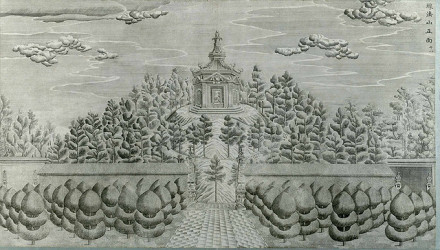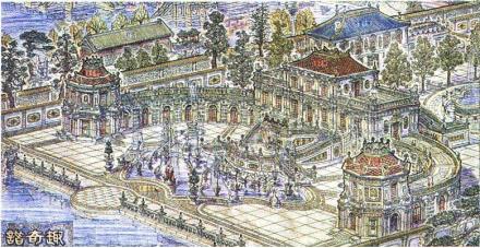 海岳開(kāi)襟,是圓明園所有樓閣中最為豪華的一組建筑,海岳開(kāi)襟建于圓明園中長(zhǎng)春園的西湖內(nèi),臺(tái)基為圓形,直徑近百米,上下兩層,漢白玉石憑欄圍繞。正樓為四出軒式的三層樓閣,下層為海岳開(kāi)襟,南檐題“青瑤嶼”三字;中層為得金閣,題“天心水面”四字;最上層題“乘六龍”三字;臺(tái)的四面各設(shè)牌樓一座。外側(cè)對(duì)稱(chēng)布置配殿、牌坊、方亭和圓廊,是一處輝煌端莊的建筑景觀(guān)。