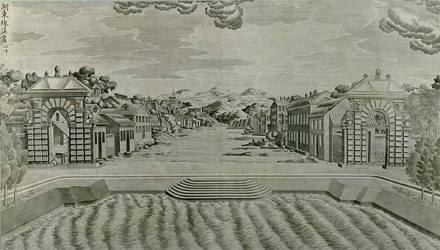 位于水木明瑟東面,是園中專(zhuān)門(mén)開(kāi)辟的一座小城鎮(zhèn),仿照古印度橋薩羅國(guó)首都的城池布局而建,是供奉各種佛像和收藏佛經(jīng)的地方。城廓呈長(zhǎng)方形,南北長(zhǎng)、東西寬,四周筑有城墻,共辟4門(mén)。城內(nèi)街道呈十字形,內(nèi)建殿宇、房舍共326間,用游廊相連接;還建有數(shù)座金碧輝煌的牌樓。城前專(zhuān)門(mén)開(kāi)設(shè)一條貫穿南北的買(mǎi)賣(mài)街,稱(chēng)蘇州街,由宮中太監(jiān)扮作商人開(kāi)市叫賣(mài),法國(guó)教士王致誠(chéng)對(duì)買(mǎi)賣(mài)街有比較詳盡的記載。