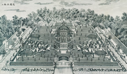 圓明園的位置在掛甲屯的北面,距暢春園約一里多路,即今北京大學(xué)的北邊,清華大學(xué)以西?滴鯐r(shí)的圓明園,里面有前湖、后湖等,其內(nèi)建有“牡丹臺(tái)”“天然圖畫(huà)”等園景。當(dāng)時(shí)圓明園還是一座藩賜園,規(guī)模不能超過(guò)皇帝的暢春園,所以建景不多,名聲也不大?珊髞(lái)隨著乾隆皇帝的登基,清王朝的盛世的到來(lái),在其多年陸續(xù)擴(kuò)建中,終于成為中國(guó)最宏偉的皇家園林。