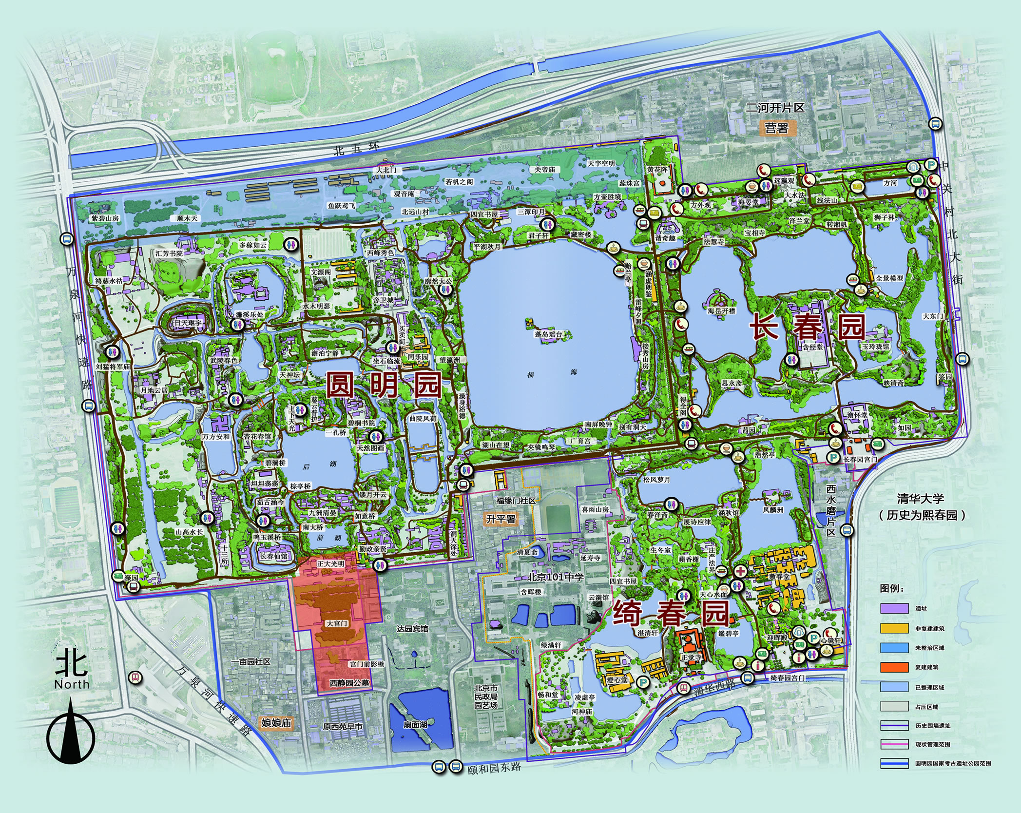 萼輝園(綺春園前身)位于暢春園的東北方向,其具體位置大致在御園北側(cè)的索戚畹園(即后來(lái)的澄懷園)以東,淑春園以北、熙春園以西,也就是綺春園(全盛規(guī)模時(shí)期)的西南部,這個(gè)區(qū)域大致為現(xiàn)一零一中學(xué)所在地。