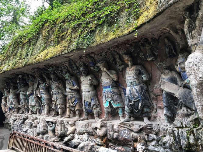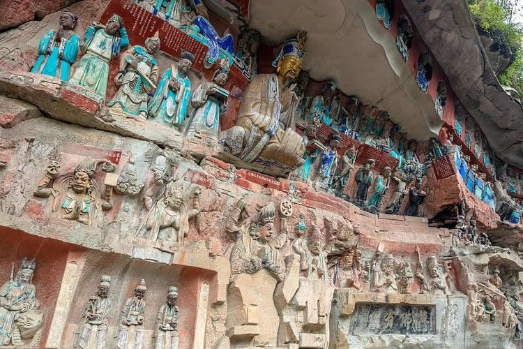 大足石刻開鑿于唐永徽元年(公元650年),盛于宋代,F(xiàn)存摩崖石刻造像5萬(wàn)余尊,銘文10萬(wàn)余寧,遍布100多處。其中比較重要的有北山(包括北塔)、寶頂山、南山、石門、石篆山石刻,是大足石刻中規(guī)模最大藝術(shù)價(jià)值最高的石刻造像代表。
