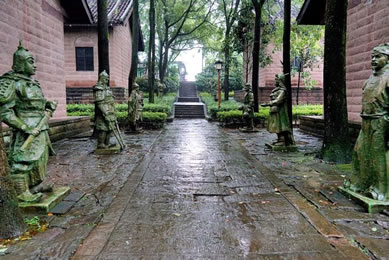 忠義祠位于護(hù)國(guó)寺右側(cè),與寺內(nèi)藥師殿僅一墻之隔,有門洞與護(hù)國(guó)寺相通,也可從護(hù)國(guó)寺右側(cè)小道進(jìn)入。始建于明弘治七年(1494年),原名“王張祠”,祀王堅(jiān)、張玨二將忠烈。明弘治十二年(1499年),合州知州宋琢見“王張祠”簡(jiǎn)陋而集資整修。明正德十二年(1517年),合州知州佘崇鳳刻石立碑并培修祠宇。清初,“王張祠”遭兵亂,片瓦無(wú)存。清乾隆二十四年(1759年),合州知州王采珍重修,立余玠、王堅(jiān)、張玨、冉琎、冉璞5位牌位祀祭,改祠名為“忠義祠”。后歷經(jīng)培修。忠義寺整座建筑由正廳、耳房和左右?guī)拷M成,采用均衡對(duì)稱式,在縱軸線主要建筑物相對(duì)對(duì)峙,構(gòu)成大門進(jìn)出的三合院。整座庭院東西寬20米,南北縱深30米。進(jìn)入石坊形大門是一個(gè)院壩兩面的廂房,拾級(jí)而上至正廳。迎面高懸“忠義千秋”金字巨匾,匾下祭臺(tái)上排列余玠、王堅(jiān)、張玨、冉琎、冉璞牌位。祭臺(tái)正面有祝文:“維神才兼武,志秉忠貞。畫地成城,據(jù)形勝而保蜀土;協(xié)力戰(zhàn)守,遺魚餅以退元戎。忠誠(chéng)貫日星,先后相繼;大節(jié)凌霄漢,古今照臨。茲屆仲春修祀典,肅陳籩豆,伏維來(lái)歆。尚饗。”廳堂楹柱有華國(guó)英撰寫的對(duì)聯(lián),上聯(lián)“持竿以釣中原,二三人盡瘁鞠躬,直拼得蒙哥一命”;下聯(lián)“把盞而澆故壘,十萬(wàn)眾披肝瀝膽,竟不圖王立二心”。忠義祠內(nèi)有宋孝宗時(shí)期碑文4塊,宋光宗時(shí)期2塊,宋寧宗時(shí)期5塊,乾道年間以后22塊,其中記錄釣魚城之戰(zhàn)史跡的12塊。
