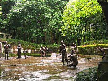 采石場(chǎng)遺址位于釣魚城基本陳列一展廳正對(duì)的游步道頂端。為讓游人了解釣魚城筑城之艱難與古代民眾付出之艱辛,遺址還原了700多年前釣魚城筑城采石的勞動(dòng)場(chǎng)景,其中的人物雕塑大小比例與真人一致。他們有的手握鋼釬在撬石頭,有的拿著手錘打鏨子,有光著胳膊抬石頭,同時(shí)還有前來(lái)送水的婦女與小孩,每個(gè)人物惟妙惟肖,充滿濃郁的生活味。