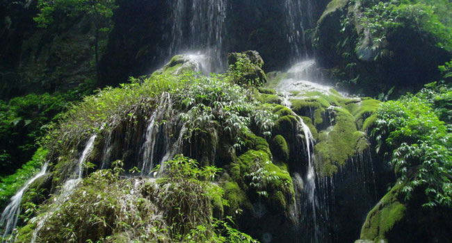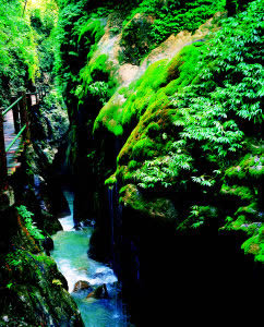 大大小小的泉水順著苔鮮爭相跳躍而下,在陽光的投射下熠熠生輝,讓你想起古人所云:“大珠小珠落玉盤。”人在峽中走,水在峽中飛,時(shí)隱時(shí)現(xiàn)的陽光,飛泉流瀑濺起的水霧,奇形怪狀的石乳形成一片如夢如幻的世界,這浪漫之旅,讓人留連忘返,不忍離去。