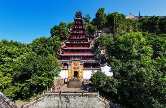 石寶寨古建筑群于明萬(wàn)歷年間始建,景區(qū)總占地面積5.4萬(wàn)平方米,建筑面積3486平方米。南臨長(zhǎng)江航道,西北側(cè)有后溪河和尖山子,東北與新石寶鎮(zhèn)相望。寨樓山頂海拔211.04米,三峽工程蓄水到175米水位后,石寶寨四面環(huán)水,在巨型圍堤環(huán)繞下,石寶寨成為長(zhǎng)江一處大型江中“盆景”,享有長(zhǎng)江“小蓬萊”美稱。寨樓依山而建,飛檐展翼,極為壯觀。閣樓共12層,通高56米。寨頂有古剎天子殿,臨巖筑墻、殿宇巍峨、蔚為壯觀,還有文物陳列室和鴨子洞、流米洞、石寶姑娘、老鷹找路等。