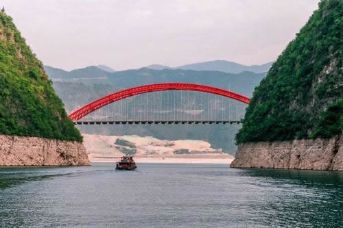 龍門大橋位于小三峽龍門峽峽口,在三峽水庫最終蓄水后,老龍門大橋主拱圈有三分之二以上部位被淹沒,橋下凈空不能滿足通航要求,因此拆舊橋建新橋。新龍門大橋與巫山長江公路大橋形成姊妹橋,遙相呼應。巫山新龍門大橋位于巫山縣城旁,舊龍門大橋下游90米處的龍門峽峽口。大橋主跨采用240米鋼管混凝土中承式拱橋一跨跨過,路線全長855.911米。其主要工程量為鋼材2900噸和混凝土1.39立方米。全橋共兩拱肋,每肋13節(jié)段,11道橫撐,采用纜索無支架吊裝成拱。