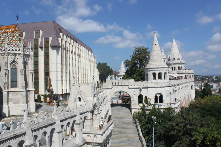 漁人堡 漁人堡(Halászbástya)是一個新哥特式和新羅曼風格的觀景臺,位于匈牙利首都布達佩斯布達一側多瑙河河畔的城堡山,鄰近馬加什教堂。它修建于1895年到1902年之間,設計師是弗里杰·舒勒克(Frigyes Schulek)。第二次世界大戰(zhàn)期間,漁人堡近乎毀滅。1947年至1948年之間,弗里杰·舒勒克的兒子亞諾什·舒勒克負責了修復工程。 如今,城堡的一部分作為餐廳使用;乩壤镉薪^佳的觀景角度,而瑪加什教堂與漁人城堡間的銅像,則是第一位匈牙利國圣·伊斯特萬一世,圣·史迪分國王雕像(King St. Stephen’s statue)圣·史迪分國王是匈牙利第一個天主教國王(公元1000年加冕),同時也可以說是匈牙利國的建立者。漁人堡旁的希爾頓旅館,外層是茶色的帷幕玻璃映照著漁人堡和一旁的教堂倒影,美麗而迷人。 從塔和觀景臺,可以看到多瑙河、瑪格麗特島、東面的佩斯,以及蓋勒特丘陵(Gellért Hill)的全景。