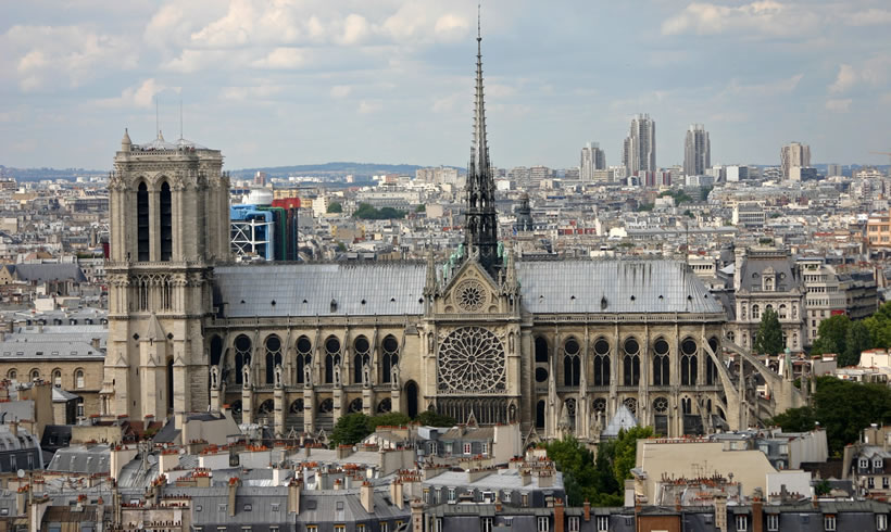巴黎圣母院 巴黎圣母院(法語(yǔ):Cathédrale Notre Dame de Paris),又名巴黎圣母主教座堂、巴黎圣母院大教堂,位于法蘭西共和國(guó)首都巴黎市中心城區(qū),地處塞納河中央西堤島上,與巴黎市政廳和盧浮宮隔河相望,為哥特式基督教教堂建筑;始建于1163年3月24日(羅馬教皇亞歷山大三世四年),是基督教支派天主教巴黎總教區(qū)主教座堂、法國(guó)首都最悠久和最具象征意義的紀(jì)念碑之一、歐洲最著名的哥特式大教堂之一、法國(guó)最具代表性的文物古跡和世界遺產(chǎn)之一,法國(guó)及歐洲文學(xué)文化地標(biāo)建筑。 巴黎圣母院平面為長(zhǎng)形馬蹄哥特式拉丁十字形制,總長(zhǎng)約127米,總寬約48米,總高達(dá)96米,總建筑面積達(dá)5500平方米,總占地面積達(dá)6000平方米;西立面置有兩座鐘塔,高約69米;內(nèi)部共有五個(gè)縱艙,包括一個(gè)中艙與兩側(cè)各兩個(gè)的翼艙,十字的頂部是祭壇,十字長(zhǎng)翼是圣母院長(zhǎng)方形主殿;東端是圣壇,后為半圓形的外墻,橫廳兩個(gè)盡段都有開(kāi)門(mén),旁置小塔;圣壇外有標(biāo)志性尖塔,高96米。巴黎圣母院是世界上第一座完全意義上的哥特式教堂,建筑本體的雕刻藝術(shù)和繪畫(huà)藝術(shù)及堂內(nèi)珍藏的大量藝術(shù)珍品具有極高的歷史文化價(jià)值和蜚聲中外的世界聲譽(yù),是法國(guó)巴黎的象征,世界主流宗教基督教圣地。