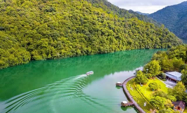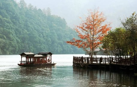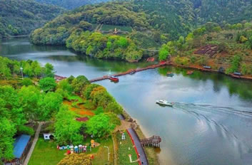景區(qū)中的水域長(zhǎng)達(dá)七公里,清澈的水流,色彩斑斕的山林倒影,構(gòu)成生機(jī)勃勃的山水畫(huà)卷,使人有“舟行碧波上,人在畫(huà)中游”的親切感受。這里是各種野生動(dòng)植物的聚集地,有各種奇花異草和珍禽走獸。每年年底到次年的初夏,總有一大群鴛鴦飛臨此地,在這水質(zhì)清純、環(huán)境優(yōu)美的地方過(guò)冬,為景區(qū)增添了愛(ài)的溫馨,傳播愛(ài)的信息。