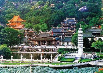 南普陀寺,位于廈門(mén)市思明區(qū),始建于唐末五代,初稱泗洲院。北宋僧文翠改建稱無(wú)盡巖。元廢。明初復(fù)建,更名普照寺。明末詩(shī)僧覺(jué)光和尚遷建于山前,殿堂院舍齊備,住僧常達(dá)百余眾,清初又廢于兵禍。清康熙二十二年(1684年),靖海候施瑯收復(fù)臺(tái)灣后駐鎮(zhèn)廈門(mén),捐資修復(fù)寺院舊觀,又增建大悲閣奉觀音菩薩,并以之與浙江普陀山觀音道場(chǎng)相類比,更名為南普陀寺,此后數(shù)百年來(lái),經(jīng)歷代主持景峰、省己、喜參諸和尚多次重修擴(kuò)建,至民國(guó)初年,已構(gòu)成三殿七堂俱全的禪寺格局。