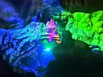 五更天: 前面“天際”出現(xiàn)魚肚白,邊上還有雄雞報(bào)曉石,接著,右前方洞頂閃爍著一顆啟明星。往前走,啟明星變成了半個(gè)月亮。在空氣濕度大、風(fēng)小、洞口外有陽光的時(shí)候,半月旁還會(huì)出現(xiàn)一輪像彩虹一般的“佛光”。 |