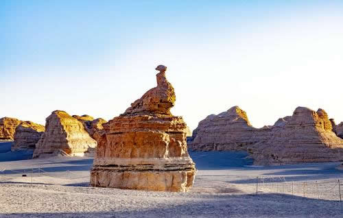 柱狀雅丹,是形態(tài)最為獨(dú)特的柱狀雅丹體。上部的粘土層難風(fēng)化,而下部的沙質(zhì)層卻易于風(fēng)化。這種差異形成了頂部粗大的塊體高懸于下部細(xì)小的柱體之上,在形態(tài)上似天外來(lái)客眺望凝思,吸引著游人去探索它的奧秘。