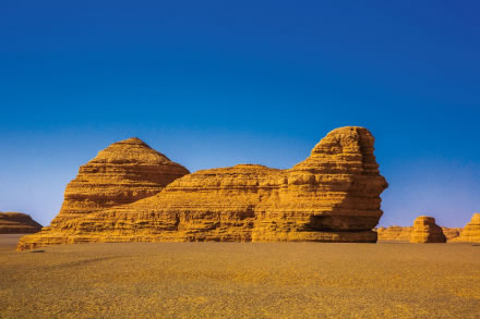 墻狀雅丹,屬于墻狀雅丹體向塔狀雅丹體的過(guò)渡類(lèi)型。雅丹體由沙質(zhì)和泥質(zhì)沉積物組成,差異侵蝕風(fēng)化作用形成了凹凸不平的表面。遠(yuǎn)遠(yuǎn)望去,酷似埃及的“獅身人面像”,充分展示了大自然的巧奪天工。
