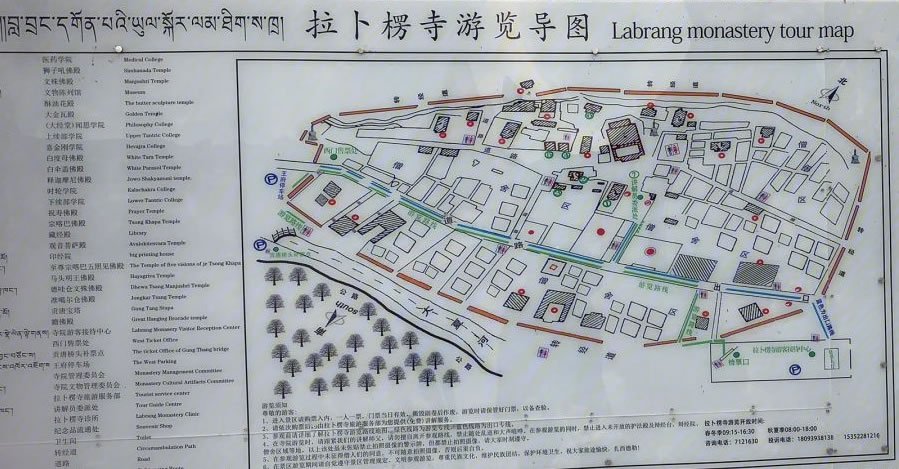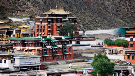 寺院坐北向南,占地總面積86.6萬(wàn)平方米,建筑面積40余萬(wàn)平方米,主要殿宇90多座,包括六大學(xué)院、16處佛殿、18處昂欠(大活佛宮邸)、僧舍及講經(jīng)壇、法苑、印經(jīng)院、佛塔等,形成了一組具有藏族特色的宏偉建筑群,房屋不下萬(wàn)間。