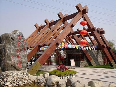 蘭州水車博覽園的南大門(正門)是一個造形獨特的木架結構的大門,它寓意著兩個意思: