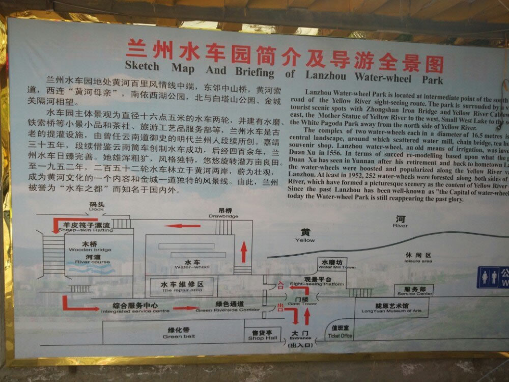 蘭州水車博覽園,位于市內(nèi)濱河路西段,東鄰“黃河鐵橋”,西鄰“黃河母親”雕塑,北望白塔山公園,南近白云觀,是濱河路旅游線上的重要一景