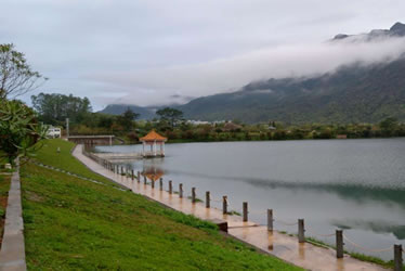 白水寨地處降雨頻密的增城北部山區(qū),充沛的降雨量不僅造就了中國內(nèi)陸第一高瀑的氣勢磅礴,也為白水寨帶來了美不勝收的湖泊風(fēng)光。瀑布從428.5米的山上飛流直下,氣勢磅礴,蔚為壯觀。瀑布源頭蒼翠、險峻的群山環(huán)抱,仙姑天湖和七仙湖就像碧綠的翡翠般鑲嵌在層林疊翠間,這兩個大型的高山湖泊總?cè)萘窟_(dá)480萬立方米。在白水寨山下,瀑布流水又匯聚成一個天然的湖泊。湖水清澈,晶瑩如玉,晴朗之際,湖面宛若明鏡,將旁邊的青山密林、綠草紅花倒映其中,美不勝收。