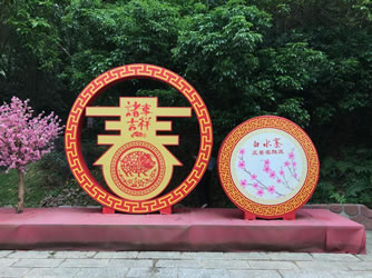 游客首先經(jīng)過三道“如意橋”,以金玉如意和大紅中國結(jié)而成,還有“!薄暗摗薄皦邸比呛蛡鹘y(tǒng)八仙向游人報喜;