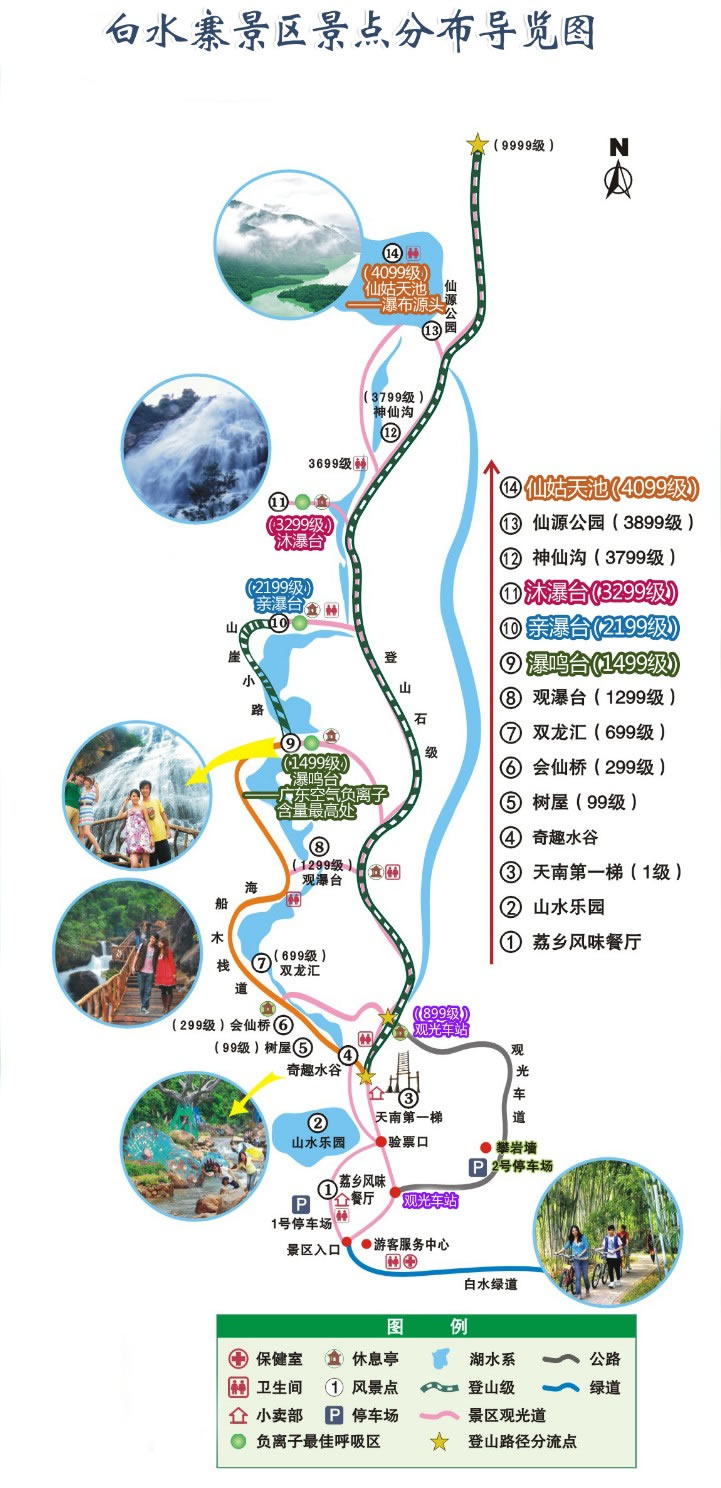 白水寨圍繞白水仙瀑及奇峰秀色,建有9999級登山步徑,總長6.6公里,19000多步,橫跨三座高山,邊接二大天池,號稱“天南第一梯”,取“勝境尋仙”、“悠閑怡景”、“知難而上”、“勇士進取”、“登高攬勝”和“登峰如愿”之義,分“尋仙、怡景、知難、攬勝、勇士和登峰”六段梯,拾級而上盡覽天南第一梯奇觀,盡享休閑健身觀光之樂,百般風(fēng)情皆可體驗。走過六段梯,登上9999,心想事成,強身健體,六六大順,長長久久。