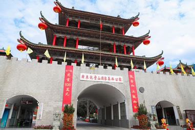 采用清代古城樓建筑風(fēng)格,飛檐翹角,氣勢恢宏,體現(xiàn)了中國古典建筑之美。內(nèi)設(shè)游客服務(wù)中心和售票處,是游客進(jìn)入觀音山景區(qū)所看到的第一道靚麗風(fēng)景。
