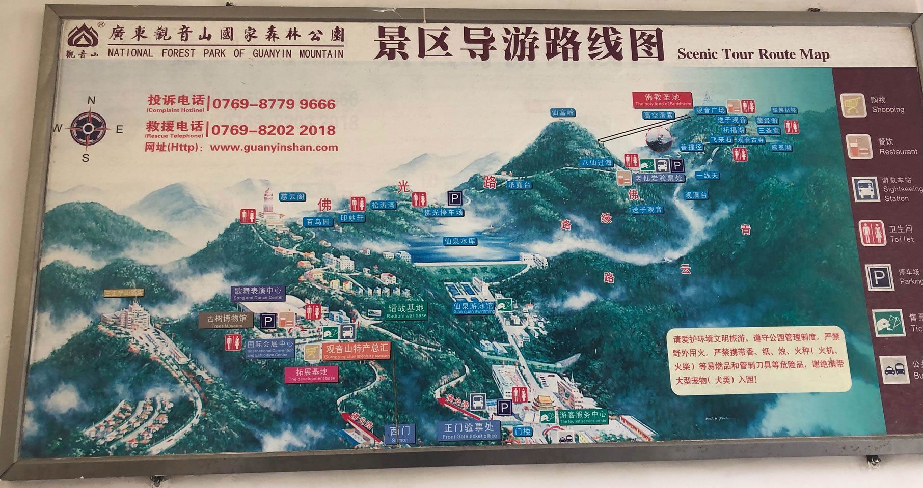 觀音山森林公園建成了以正門樓、觀音廣場、觀世音菩薩法像、仙宮嶺、普渡溪、感恩湖、回音壁、怡心亭、慈云閣、先人石壘、古樹博物館、國際會展中心、仙泉游泳館等20余處景點(diǎn)。