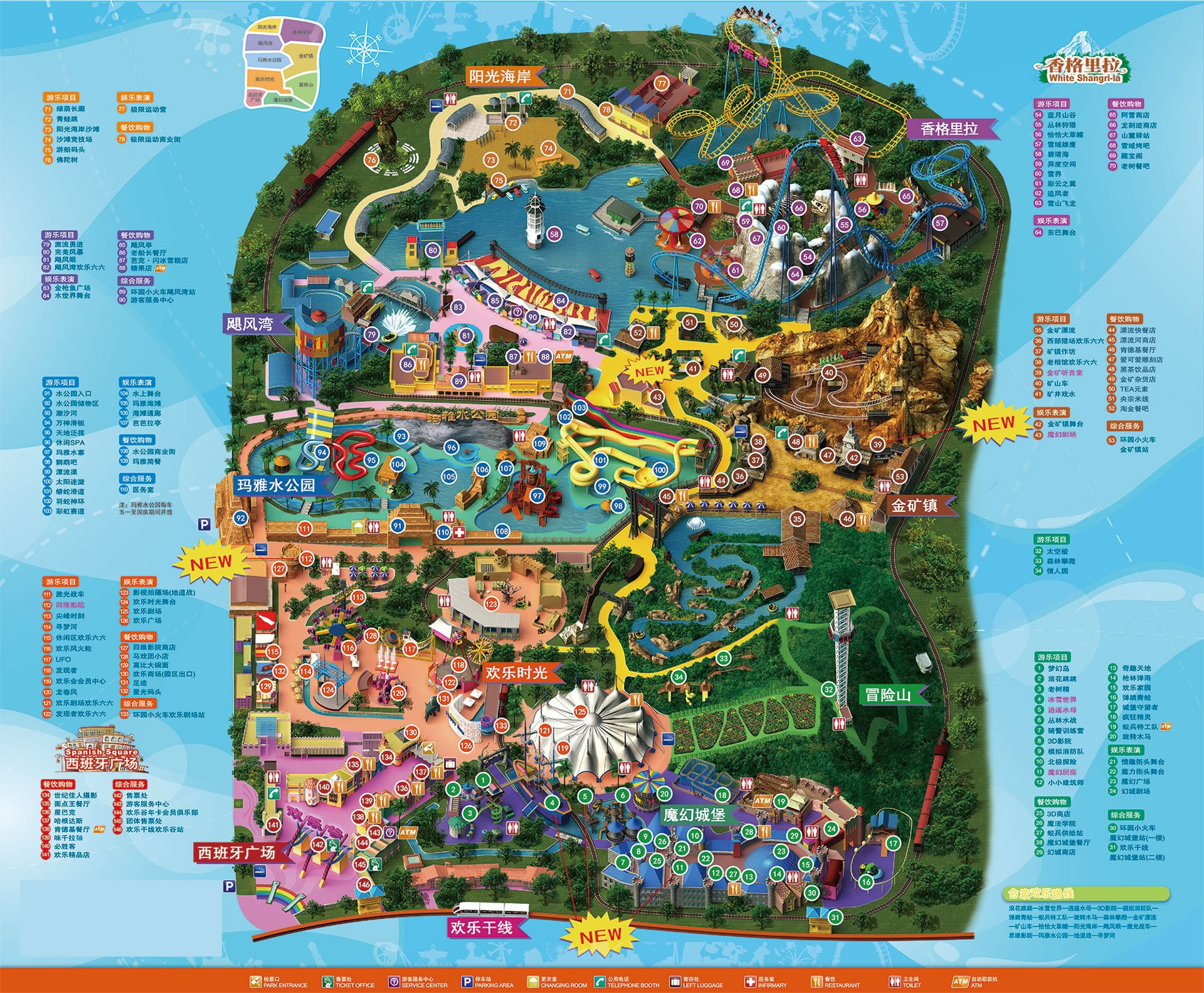 全公園共分八大主題區(qū):西班牙廣場(chǎng)、卡通城、冒險(xiǎn)山、歡樂(lè)島、金礦鎮(zhèn)、香格里拉森林、颶風(fēng)灣、陽(yáng)光海岸,加上奇趣的瑪雅水公園,有一百多個(gè)老少皆宜、豐富多彩的游樂(lè)項(xiàng)目。從美國(guó)、荷蘭、德國(guó)等發(fā)達(dá)國(guó)家引入眾多全國(guó)乃至亞洲獨(dú)有的項(xiàng)目:世界最高落差的"激流勇進(jìn)"、中國(guó)第一座懸掛式過(guò)山車(chē)"雪山飛龍"、中國(guó)第一座巷道式"礦山車(chē)"、中國(guó)第一座"完美風(fēng)暴"、中國(guó)第一輛"仿古典式環(huán)園小火車(chē)"、亞洲最高、中國(guó)第一座"驚險(xiǎn)之塔"--太空梭、亞洲首座集視覺(jué)、聽(tīng)覺(jué)、觸覺(jué)于一體的四維影院。這些游樂(lè)項(xiàng)目附以了逼真而完美的主題包裝,營(yíng)造出環(huán)境優(yōu)美宜人,具有美國(guó)西部和中國(guó)藏北風(fēng)格的景觀(guān)。一次次驚心動(dòng)魄的歷程,一個(gè)個(gè)撲朔迷離的故事,讓游客仿佛進(jìn)入一個(gè)亦真亦幻的神秘境界。