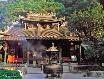 梅州靈光寺布局奇巧,主殿以"菠蘿頂"建筑為最大特點,乃全國罕見,堪稱廟堂建筑藝術(shù)的杰作。這個最大的佛殿(又名“菠蘿殿”),重檐歇山頂,面闊三間,寺內(nèi)香火盛時,殿內(nèi)仍不留一絲煙縷,殿頂亦片葉不留,可能與菠蘿頂有關(guān),這是建筑科學(xué)史上的一大杰作。