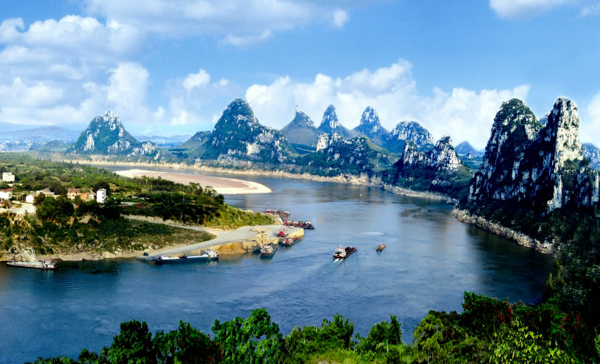 五馬攔江,位于武宣縣城南郊,黔江南岸有5座弧列的山巒,活似5匹駿馬,將黔江截?cái)r,強(qiáng)令黔江水繞東流,氣壯山河,江山輝映,景色迷人。在5匹駿馬之間,聳立一座竹筍狀的文筆峰,面對(duì)江中200余米長(zhǎng)的橢圓形沙洲,俗稱:“古磧?yōu)?rdquo;,是武宣縣老八景之一—《古磧鐘聲》。昔日江水擊洲,聲如鐘鳴。