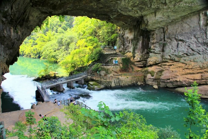 響水瀑布洛江灘頭,河水奔流而下,其聲隆隆,遠(yuǎn)聞若雷,近聞似鼓,四季如此,故此得名“響水”。此響水灘為典型的喀斯特地貌,水流呈階梯狀分布,在地質(zhì)學(xué)上稱為邊石壩,所含成份多為鈣化石?膳c九寨溝五彩池比美。