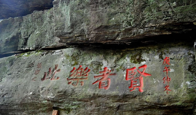 西祖巖摩崖石刻在平山鄉(xiāng)金洞村(現(xiàn)叫紅巖)東600米西祖巖壁上。有幅直寫(xiě)顏體“西祖巖”三字(字徑60×60厘米),上款“嘉定丙子六月朔日”,下款“轉(zhuǎn)運(yùn)判官方信儒題”。有幅直寫(xiě)草書(shū)“無(wú)崖別境”(字徑30×30厘米),上款“道光已丑六月朔日”,下款“州同知吳元鷗題”。有幅草書(shū)“薅”一字(字徑90×40厘米),上款“道光已丑六朔日”,下款“舉人吳元鶴題”。在巖廳正面,尚見(jiàn)幾幅殘存浮雕(每幅60×30厘米),有“禹跳龍門”、“麒麟戲珠”、“慈竹”、“寒梅”畫(huà)幅。