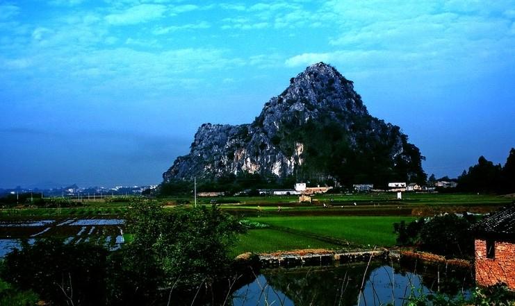 在靈山縣三海鎮(zhèn)梓崇村馬鞍山,山為喀斯特孤峰,形似馬鞍,山下有東勝巖、葡地巖和盡頭巖三洞。 1960年,廣東師院、廣東省文物管理委員會(huì)考古隊(duì)和中國(guó)科學(xué)院古脊椎與古人類研究所賈蘭坡、顧玉珉、顧閻等在東勝巖發(fā)現(xiàn)1塊顳骨的鼓室部、兩顆牙齒和一段左側(cè)股骨上段,在葡地巖發(fā)現(xiàn)1塊頂骨和3塊額骨,東勝巖還出土熊的化石和鈣化蝸牛,葡地巖出土中國(guó)犀牛、野豬、鹿和牛化石,專家研究鑒定為更新世末期的人骨化石,命名為靈山人化石出土地點(diǎn),此外,還在石背山洪窟洞古人類遺址,出土1塊頂骨、1塊髖骨、1枚上臼齒、2枚板齒,代表老年個(gè)體、屬舊石器時(shí)代,在石塘鄉(xiāng)鐘秀山滑巖洞遺址,發(fā)現(xiàn)10塊頭骨、70枚牙齒、1塊髖骨、1件穿孔石珠和一些網(wǎng)紋、繩紋陶片,研究鑒定為新石器時(shí)代的人骨。 1962年2月廣東省靈山縣綠水公社綠水村社員在一處山坡上挖出了一件銅鼓,廣東省文物管理委員會(huì)得知后,派員至現(xiàn)場(chǎng)作了調(diào)查,并將銅鼓運(yùn)回廣州,發(fā)現(xiàn)銅鼓的山崗很高,約二百余米,銅鼓就埋在半山坡距地面約三四十米的地方,在山崗周圍沒有發(fā)現(xiàn)什么古代文化遺址或墓葬,附近也沒有找到什么共存遺物,只在銅鼓內(nèi)殘存的泥土中找到了一枚唐代的開元通寶,說明這只銅鼓是在唐代或以后才被埋入土中,銅鼓很大,面徑81、通高47厘米,除足部稍。